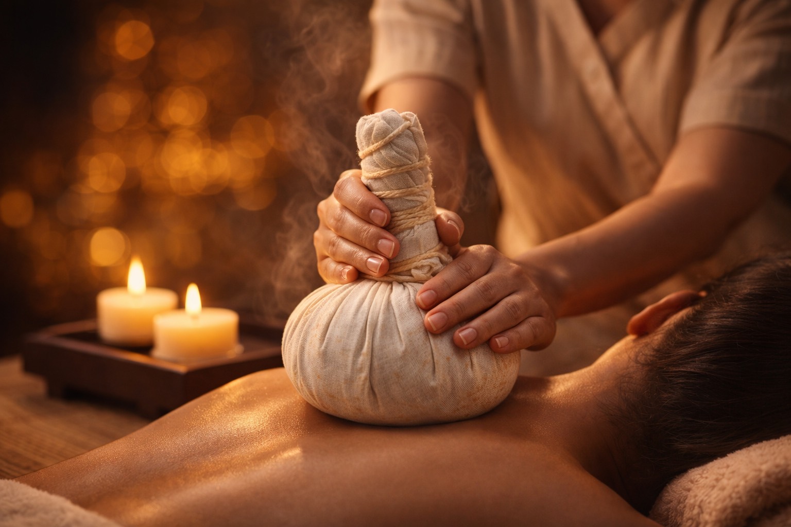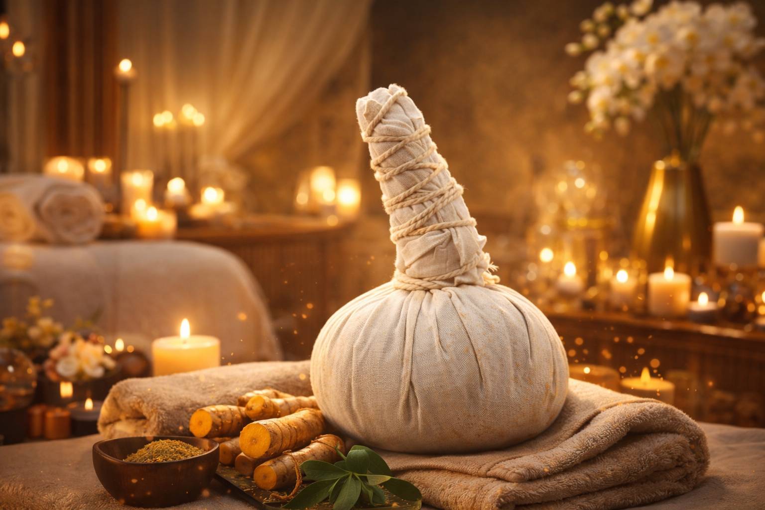 ลูกประคบสมุนไพรทำจากสมุนไพรหลายชนิด เช่น ไพล ขมิ้นชัน ตะไคร้ ใบมะกรูด และการบูร โดยนำสมุนไพรมาห่อในผ้าฝ้ายแล้วนำไปนึ่งให้ร้อนก่อนนำมาประคบบริเวณที่ปวดเมื่อย ความร้อนจากลูกประคบช่วยให้กล้ามเนื้อคลายตัว กระตุ้นการไหลเวียนของเลือด และช่วยลดความตึงของกล้ามเนื้อ ทำให้ร่างกายรู้สึกสบายและผ่อนคลายมากขึ้น